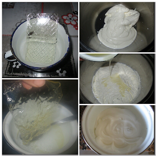 - Poner en un cazo el azúcar y 50 ml de agua. Lleva a ebullición, retirarlo y añade las hojas de gelatina previamente escurridas. Remueve hasta que se fundan por completo.